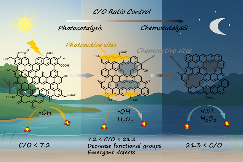 上述认识对于理解碳基物质在地质环境系统中的化学行为具有的启示。在天然水环境中,碳质颗粒往往经历持续的氧化—还原循环,其表面官能团逐渐减少、缺陷逐步累积,这意味着其反应模式可能由光驱动逐步转向缺陷驱动的暗反应过程。这一转变将直接影响变价元素的价态转化及迁移行为,并可能重塑水体中变价元素的时空分布格局,从而对生态系统产生深远影响。