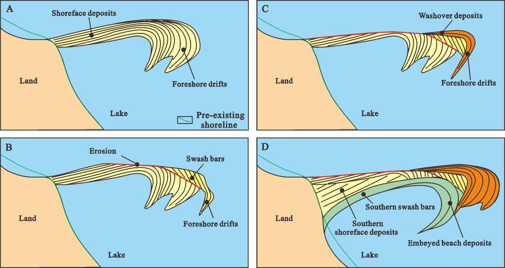 研究团队通过综合多年湖平面观测、风场数据、遥感影像及多次野外实地考察,首次系统阐明了二郎剑沙嘴滩坝在水动力作用下的形成过程与沉积物输运机制。研究明确指出了沙嘴滩坝不同部位分别处于侵蚀或沉积的动态过程,并精细刻画了其复杂的砂体展布规律(图1)。为进一步揭示其长期演化历史,团队结合探地雷达探测与探槽取样分析,重建了该沙嘴滩坝过去2000余年来的地质演化序列。结果表明,沙嘴滩坝的发育显著受湖平面变化控制,具有明显的阶段性特征:湖平面较低时期以侧向加积为主,而湖平面升高阶段则转为垂向加积为主。在此基础上,研究提出了二郎剑沙嘴滩坝演化的四个沉积阶段,并建立了相应的沉积演化模式(图2)。该成果不仅深化了对高原湖滨沉积体系形成动力与演化规律的科学认识,所建立的沉积模型更为地下油气储层中滩坝砂体的精细刻画与成因解释提供了关键的地质参考,展现了现代沉积研究在连接沉积学理论与油气勘探实践中的重要桥梁作用。