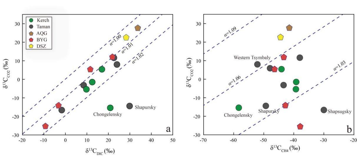图 1 准噶尔与库班泥火山中CO2和CH4的碳同位素组成:(a) δ13CDIC与δ13CCO2的关系;(b) δ13CCH4与 δ13CCO2的关系