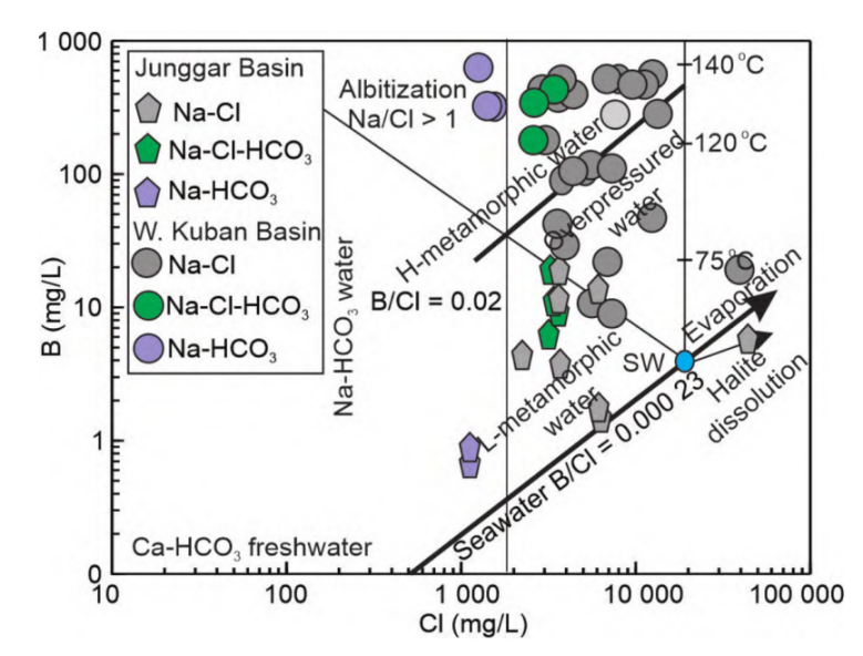 图 2 氯离子与硼的关系图。基本分界线:海水的 B/Cl 比值 = 0.00023;变质水的 B/Cl = 0.02(White 和 Waring,1963);高变质水的 B/Cl > 0.02;低变质水的 B/Cl 在 0.00023 与 0.02 之间。依据 Boschetti(2011),图中标示了超压水的位置。所示计算温度基于硼地热温标(Boschetti 等,2016)